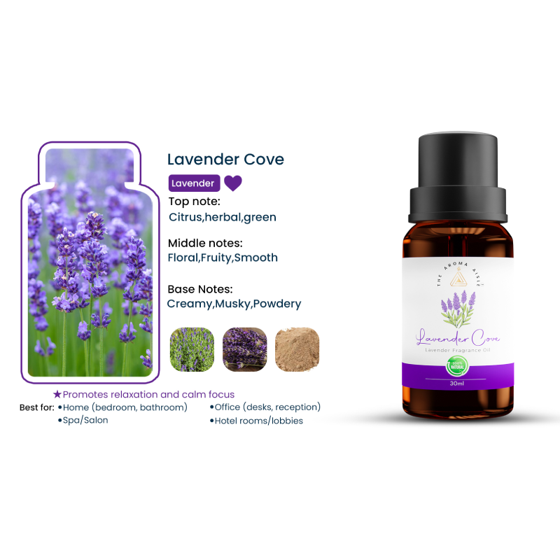 The oil’s naturally derived rose-gold tint provides a delicate visual complement to its floral profile. Available in practical sizes, ranging from a 100ml everyday option to a 1000ml premium bottle, it suits both personal use and professional settings like spas. Fully compatible with The Aroma Aisle’s diffusers, Lavender Cove transforms any room into a quiet, restorative retreat.